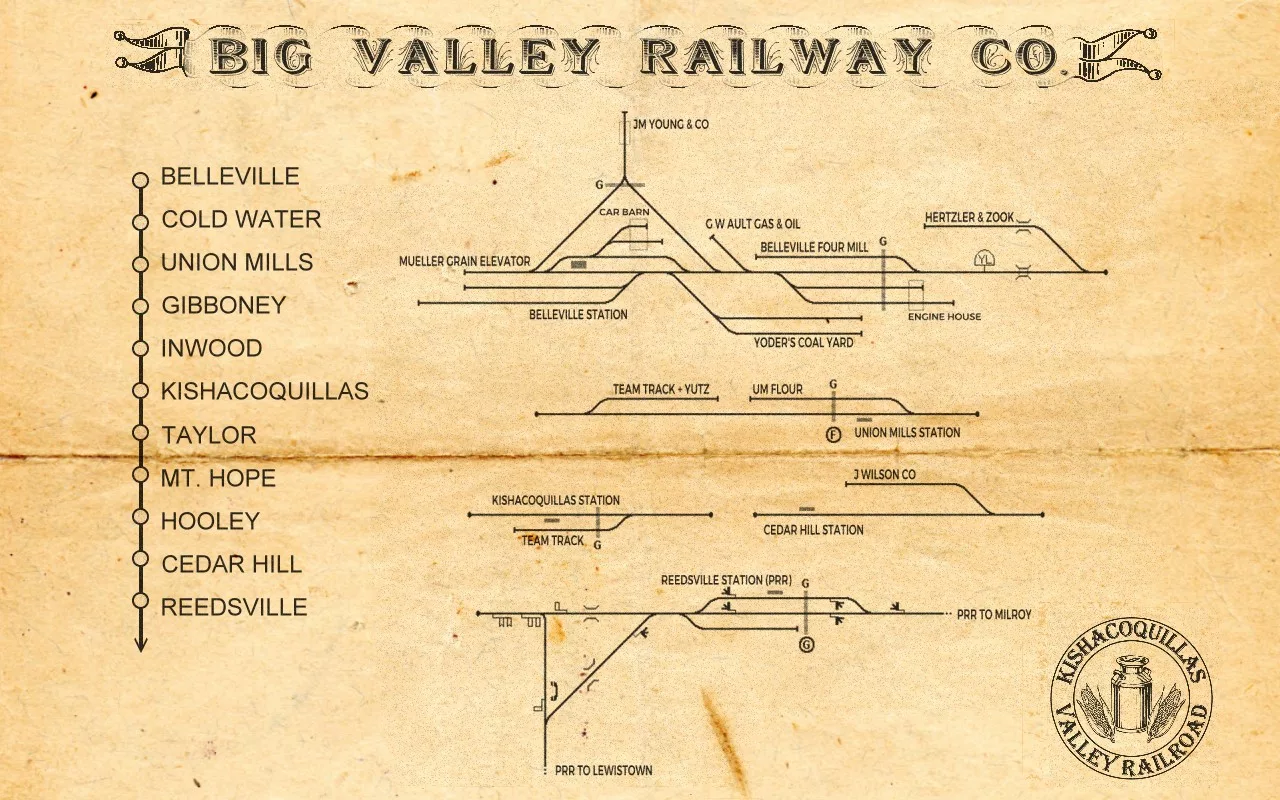 A short line route based on the Kishacoquillas Valley Railroad (1893-1940) between Belleville & Reedsville in central Pennsylvania.